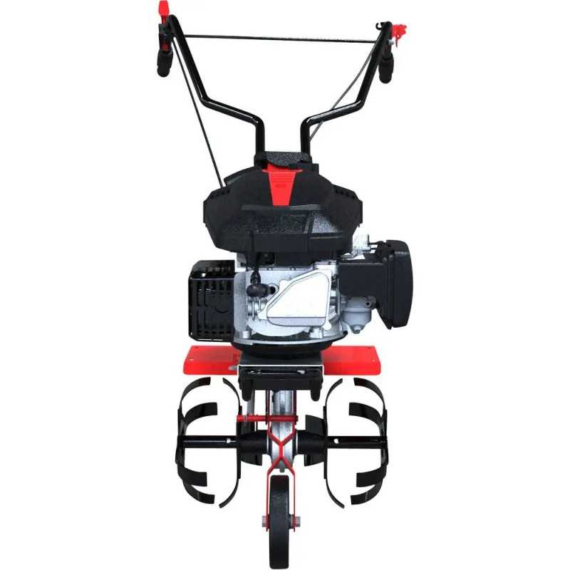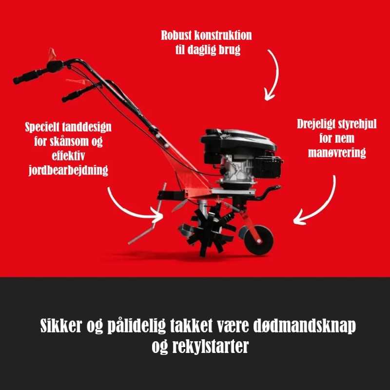 Freseren har et bredt håndtak og et roterende hjul - noe som gjør det lett å håndtere maskinen. I tillegg tennes den enkelt ved hjelp av easy-start rekylstarter, og den er utstyrt med en dødmannsbryter, som stopper jordfreseren med en gang hvis man gir slipp. Effektiv, behagelig bruk med sikkerheten i topp.