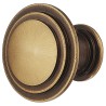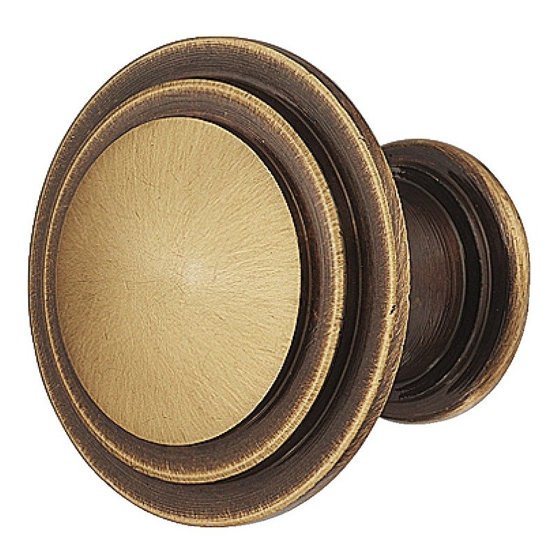 Tradisjonell rund knopgrep i messing med en brun antikk overflate.
