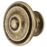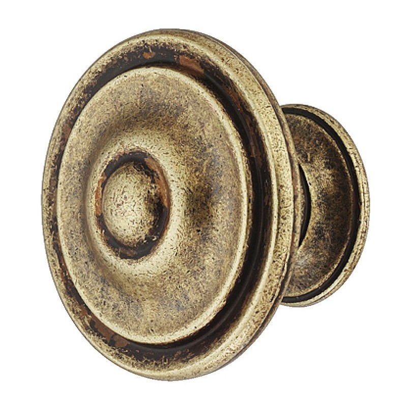 Tradisjonell rund knotthåndtak i sinklegering med en brun antikk overflate.