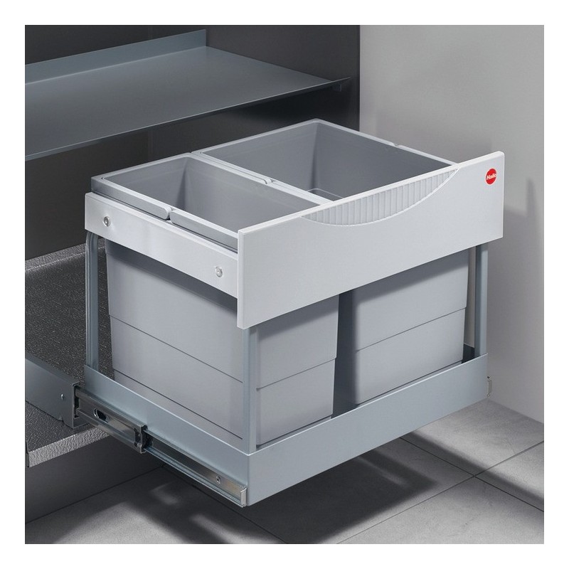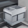 Flott søppelbøtte med store bøtter. Skal monteres i bunnen av skapet, og kan her trekkes ut med fullt uttrekk.