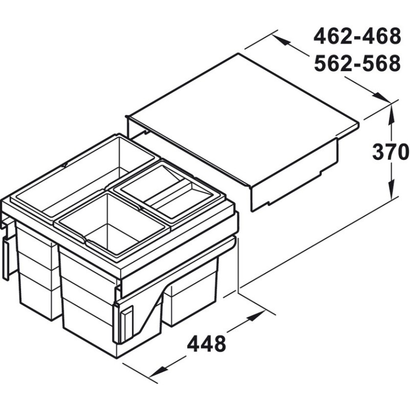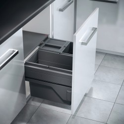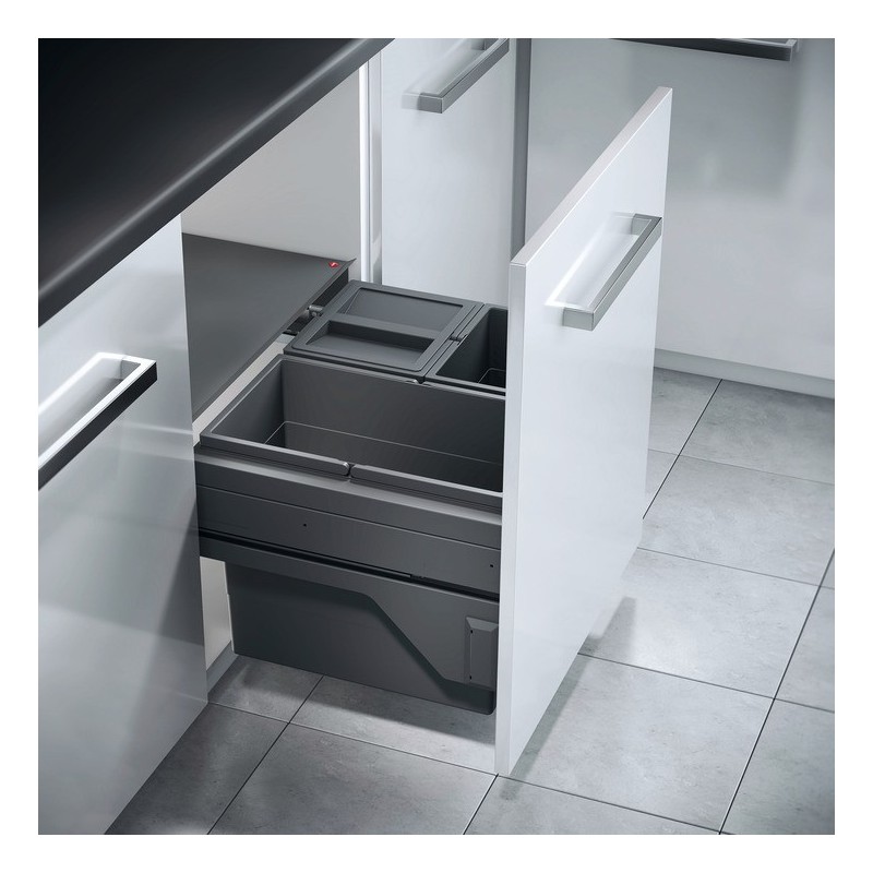 Smart og romslig hengende søppelbøtte med 3 bøtter. Denne modellen er til påskruing på korpussiden.