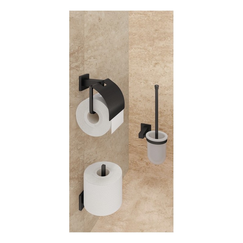 Moderne toalettbørstesett i grafitt svart messing samt satin frosted glass for oppheng på badet.