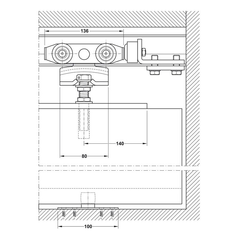 - Montering: Beslag skrus fast på toppen av døren, samt boltes fast nede i døren. Beslaget settes i skinnene (tilbehør) som er montert på veggen eller i taket