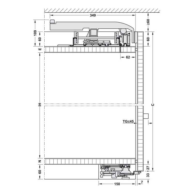 - Totalhøjde Q = C + 33 mm (OBS! Afstand til loft skal være minimum 60 mm!)