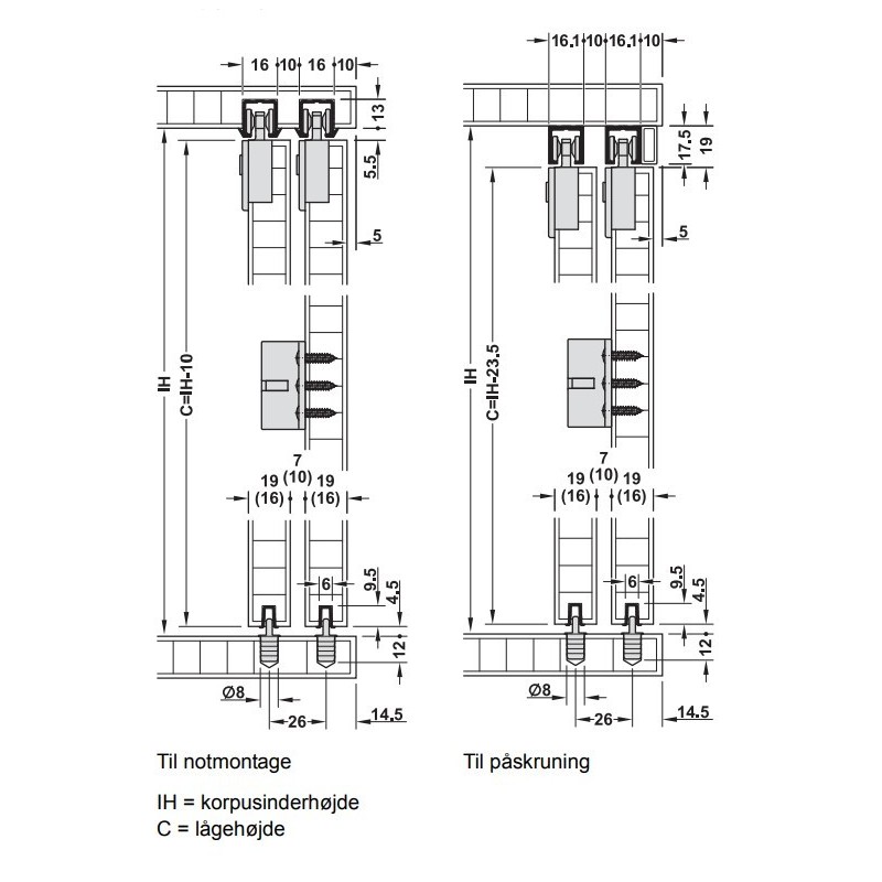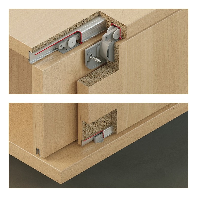 Denne model bruges til indeniliggende skydelåger, hvilket vil sige at skabslågerne kører inde mellem skabssiderne