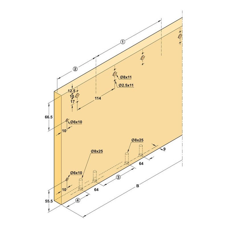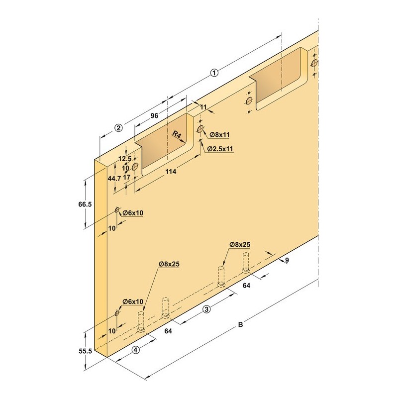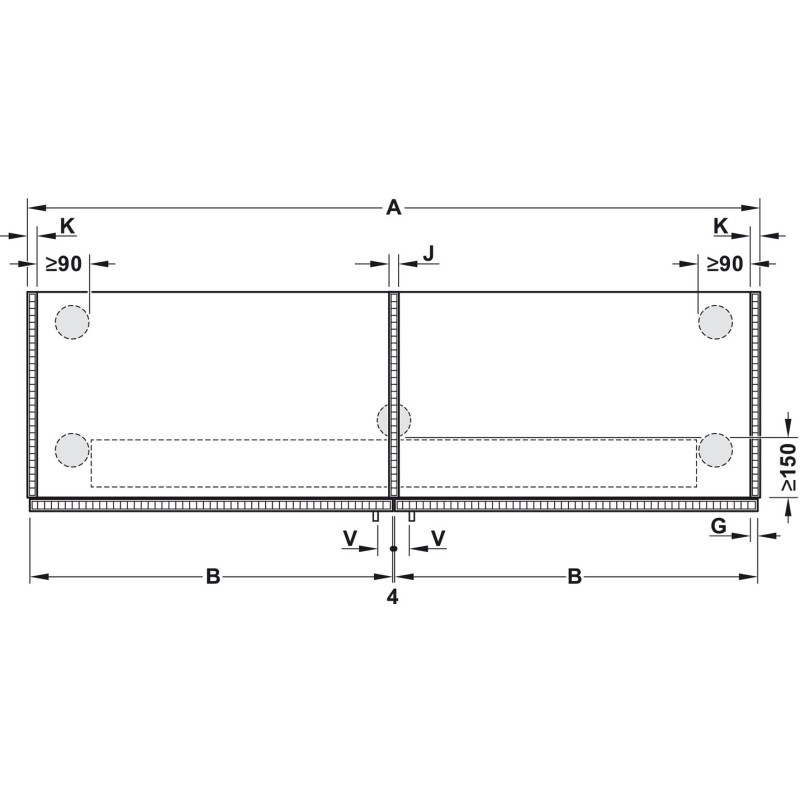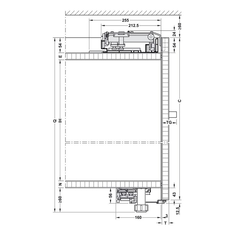 - Nedfræset beslag foroven uden låge: Min. 255 mm