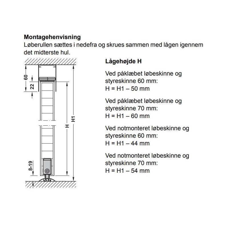 - 1 løbeskinne: top (dobbelt eller tredobbelt løbeskinne ved 2 eller flere låger)