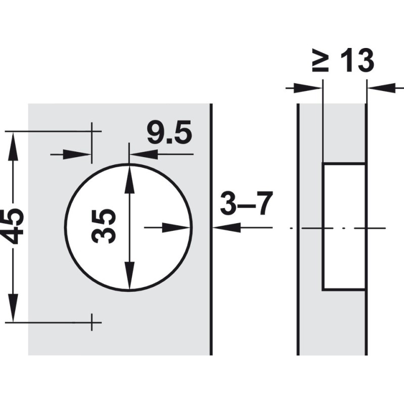 Dette hengselet passer til Blum montasjeplater. Montasjeplaten må kjøpes i tillegg. For dette hengselet må montasjeplaten alltid ha avstand: 6 mm