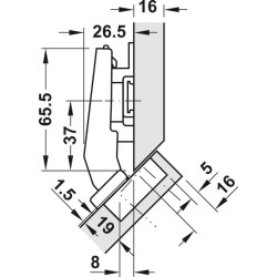 Blum Clip Top Blumotion kopp-hengsel med 45 graders vinkelbruk, som ofte brukes i hjørneskap der døren ligger 45 grader på kroppen.