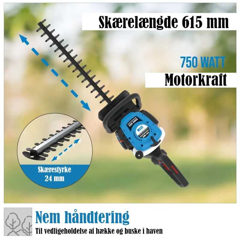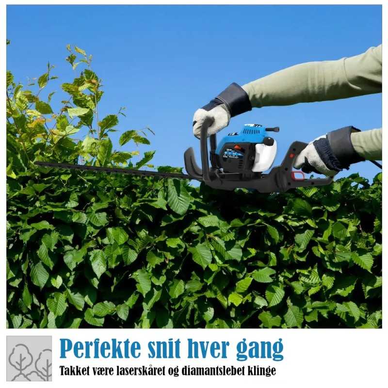 Denne hekksaksen har en sterk 2-takts OHV motor med primerpumpe, easy start og antivibrasjonssystem. Med den sterke motoren og den imponerende 615 mm kuttelengde er grener opp til 27 mm i tykkelse ingen problem. Mer enn nok til å hekken ser vakker ut dag etter dag.