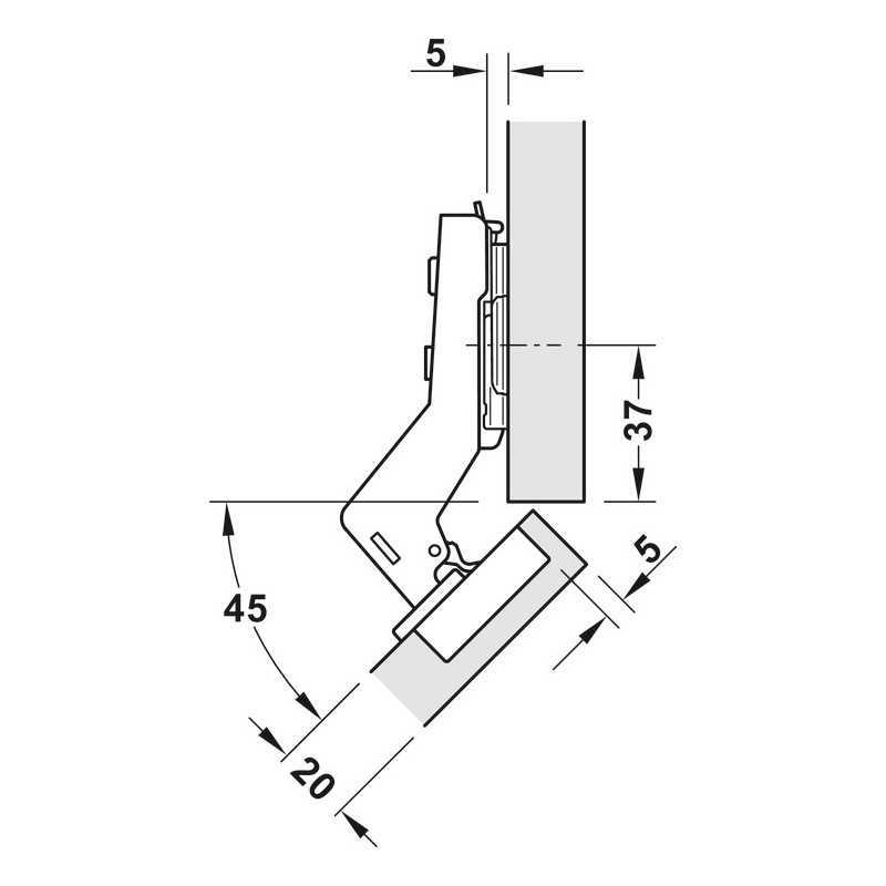 Häfele Metalla 310 A hengsel til hjørneskap. Kan fås til bruk ved 30° eller 45° hjørnevinkler.