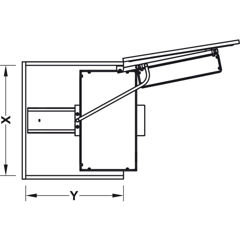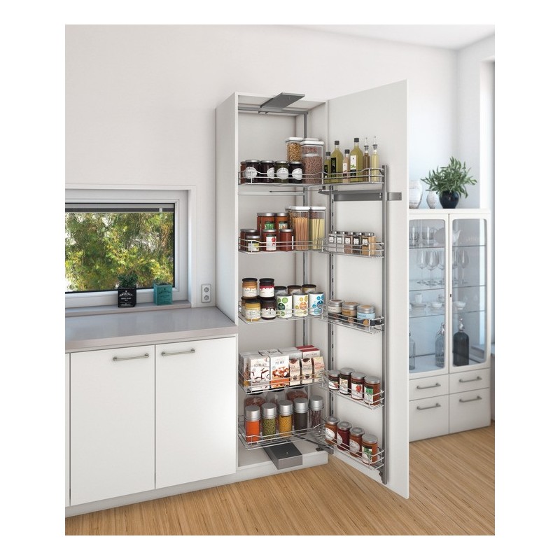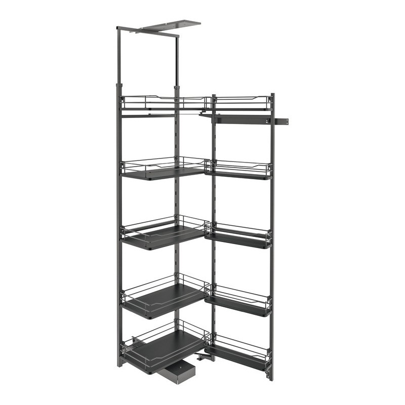 Komplett høyskap-uttak fra Häfele for montering bak svingdør, som gir muligheten til å utnytte hele skapet i dybden. Dette smarte høyskaputtrekket er i antrasitt og er ideelt for dype skap.