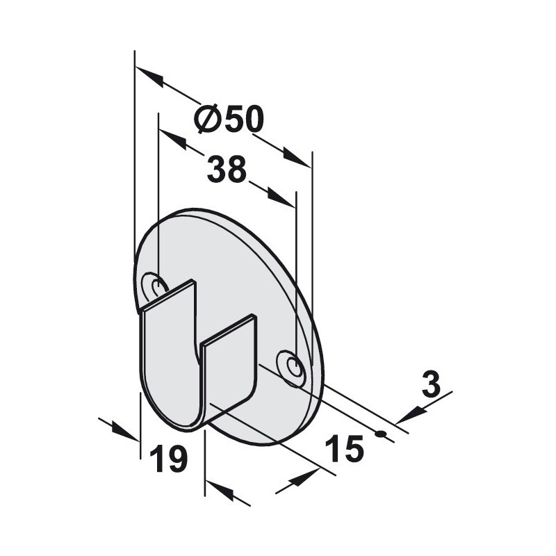 Endebeslag i matte børstet rustfritt stål til påskruning på korpusside. Denne modellen har 2 skruehull.