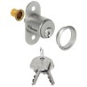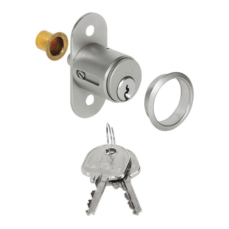 Trykkylinderlås for tre-skyvedører med 5 indre stifttumblere. Låsen er laget i matt forkrommet zinklegering med sylinder i messing.