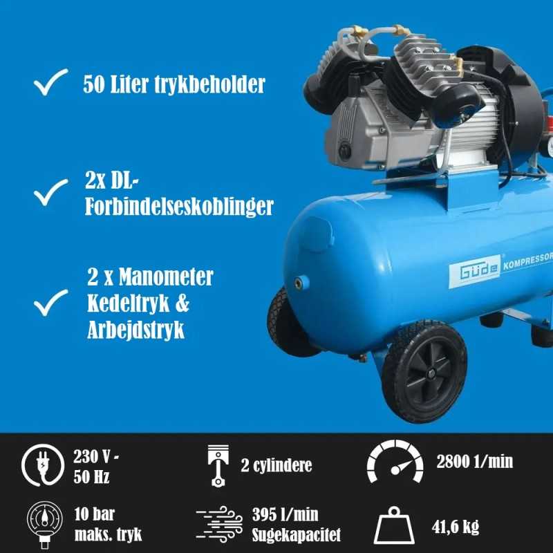 Güde kompressor 400/10/50N er en sterk kompressor med oljesmurt 2-sylindermotor V-enhet og direkte drift.