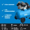Kompressoren har en stor 50 L kedeltank, og kan nå et trykk på maks. 10 bar. I tillegg har den trykkreduserende funksjon, som gjør det enkelt å justere trykket. Det er også sikkerhetsventil og kondensdrenering, samt mottrykksventil og integrert luftfilter.