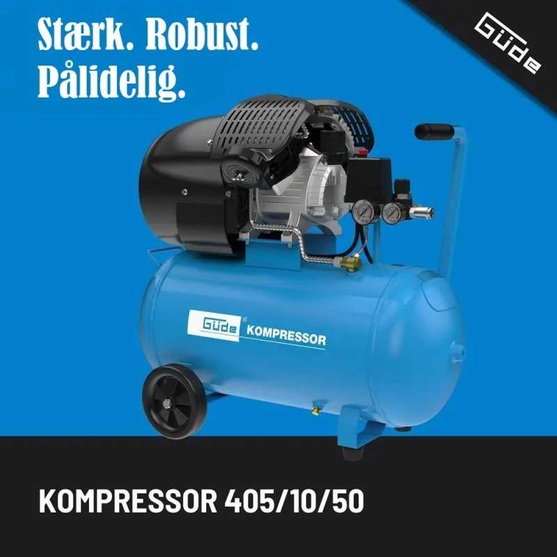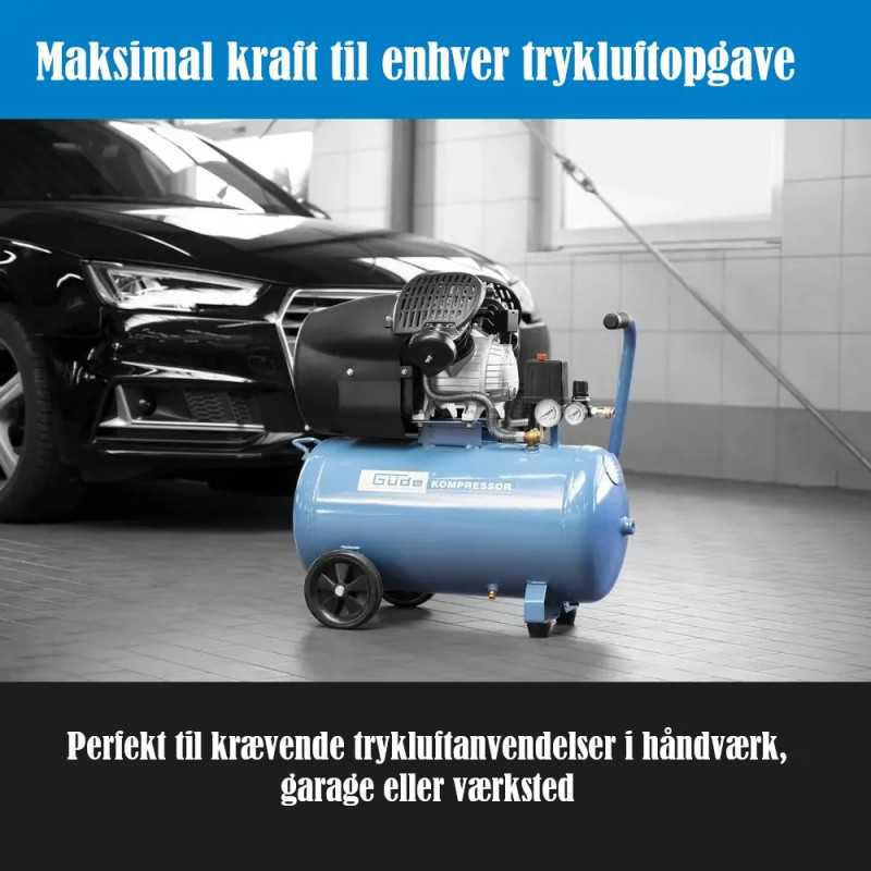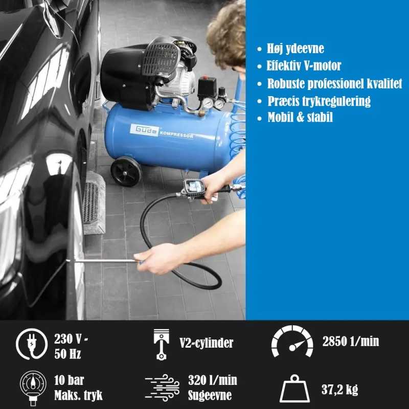 Super kompressor fra Güde med oljesmurt 2-sylindret V-motor, som har direct drive.