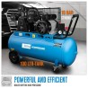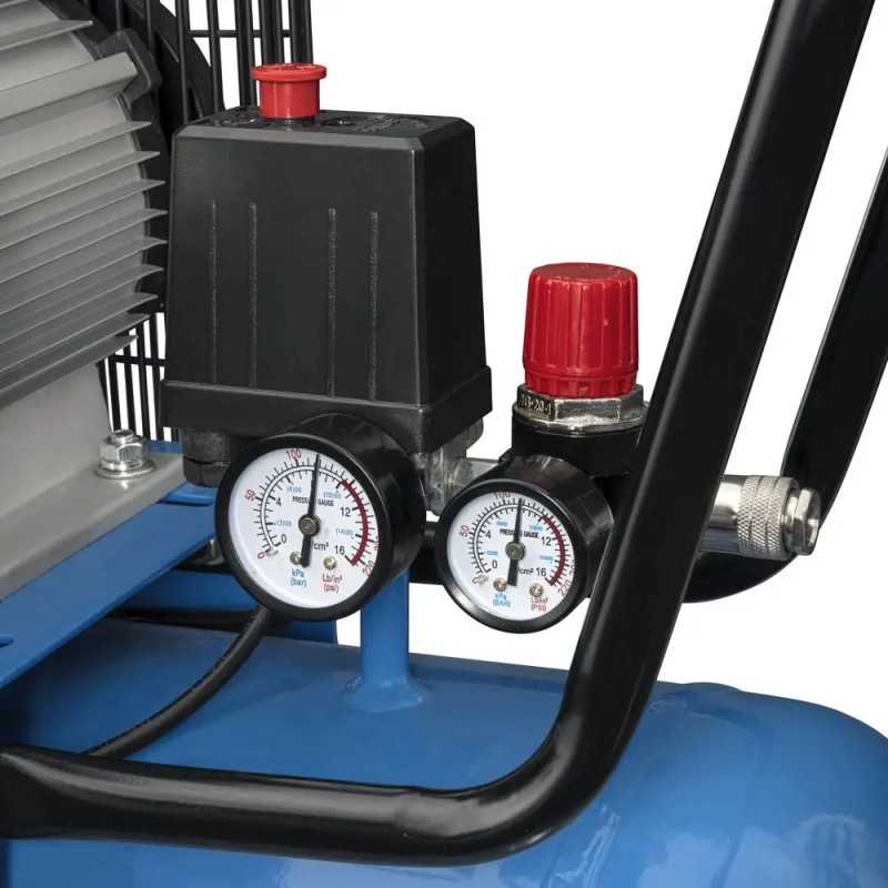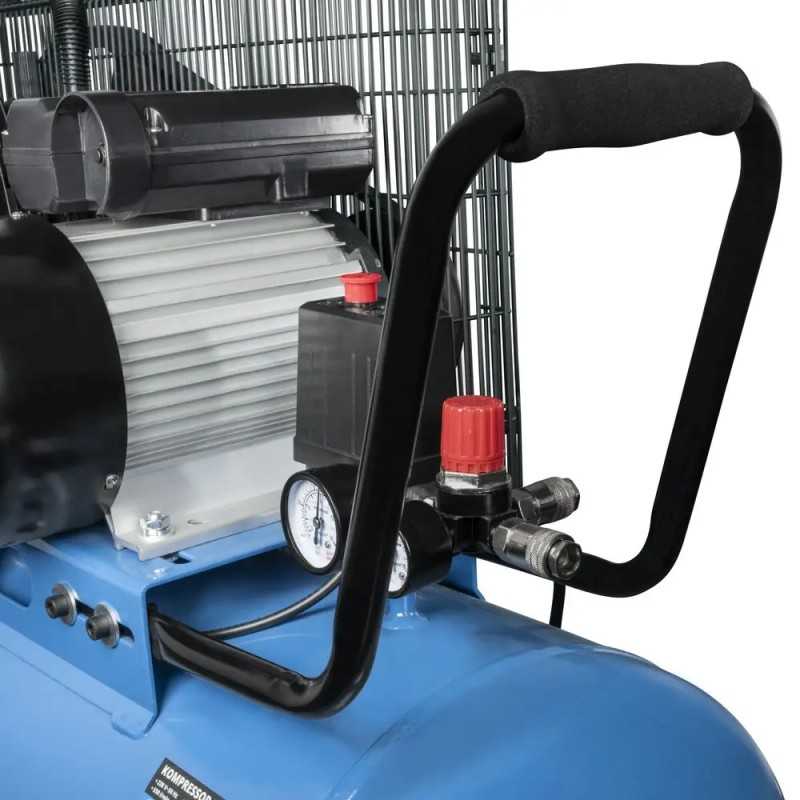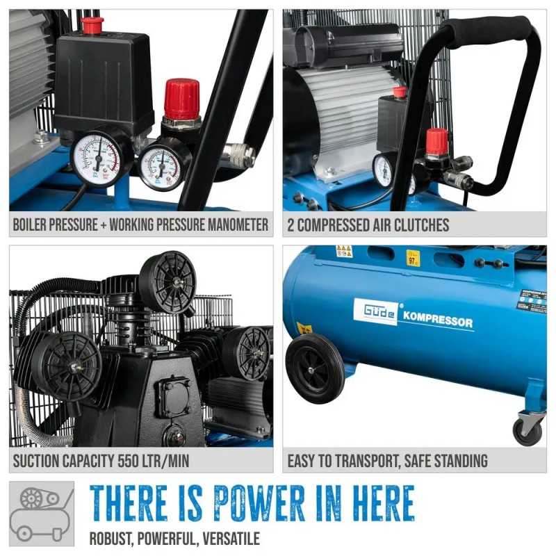 Den kan håndtere opptil 10 bar trykk og har en imponerende tank med et volum på hele 100 L. I tillegg har den trykreduserende funksjon, som gjør det enkelt å justere trykket. Det er også sikkerhetsventil og kondensdrenering, samt mottrykksventil og 2 integrerte luftfiltre. Det er trykkmåler både for kjelletrykk og arbeidstrykk, samt overbelastningsbeskyttelse og etterkjølingsfunksjon.