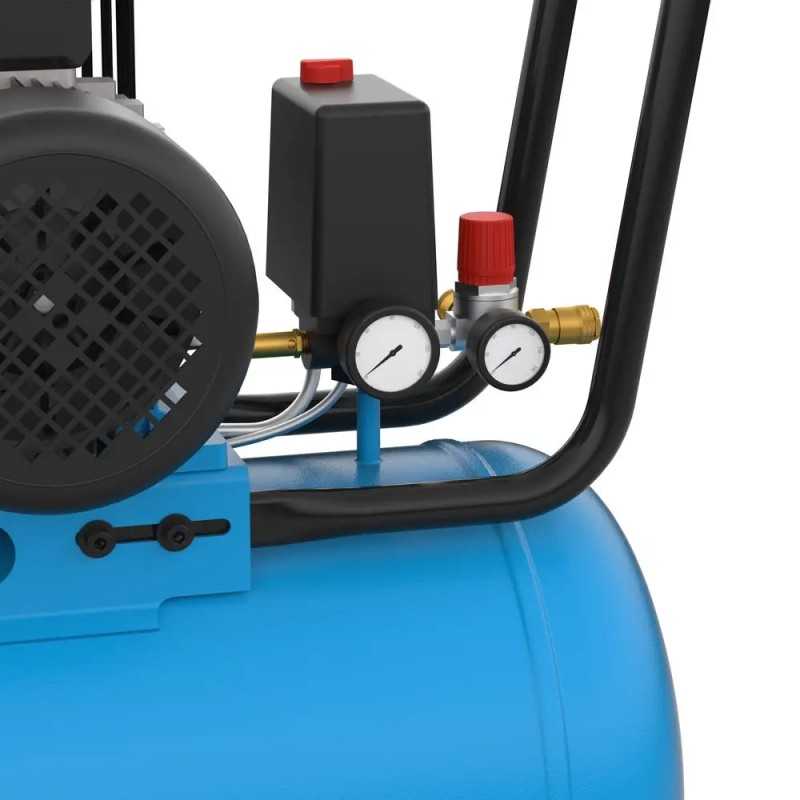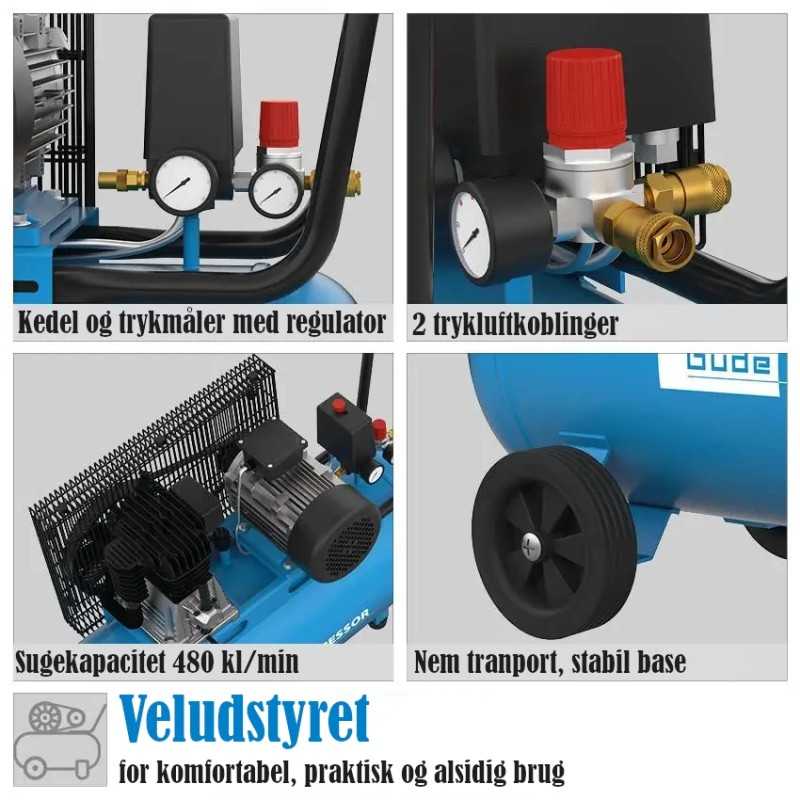I tillegg har den trykkreduserende funksjon, som gjør det enkelt å justere trykket. Den har også sikkerhetsventil og kondensdrenering, samt mottrykksventil og integrert luftfilter. Det er trykkmåler både for kjelletrykk og arbeidstrykk, samt overbelastningsbeskyttelse og etterkjølingsfunksjon.