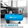 Maskinen har en massiv 2-twin-sylinder motor med remdrift. Den kan klare opp til 10 bar trykk og har en imponerende tank med hele 100 L volum.
