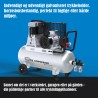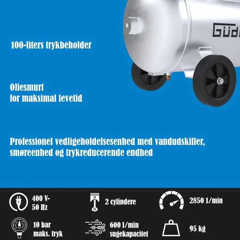 Maskinen har en massiv 2-sylindret motor med remdrift og en kjele på 100 L volum, som er galvanisert både på innsiden og utsiden. Den kan håndtere opptil 10 bar trykk og har en vedlikeholdsenhet med vannskiller, smørefunksjon og trykkreduksjon.