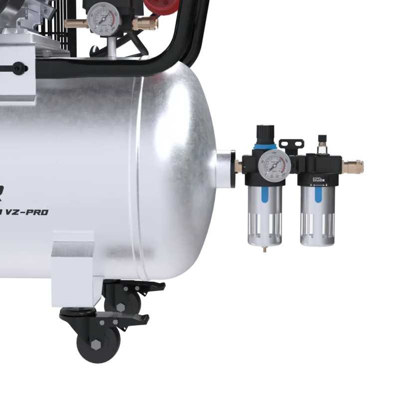 Utrolig enkelt å justere trykket, takket være trykkreduksjonen og høykvalitets trykkbryter. Det er også sikkerhetsventil og kondensdrenering, samt mottrykksventil og integrert luftfilter. Det er trykkmåler både for kjelens trykk og arbeidstrykket, samt overbelastningsbeskyttelse.