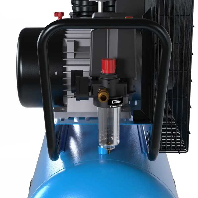 Güde 635/10/90 PRO er en solid kompressor med 2-sylindret motor med remdrift og tank på 100 L volum. Den kan håndtere opptil 10 bar trykk.