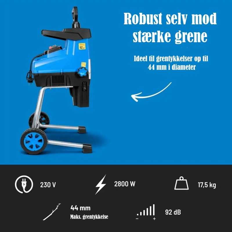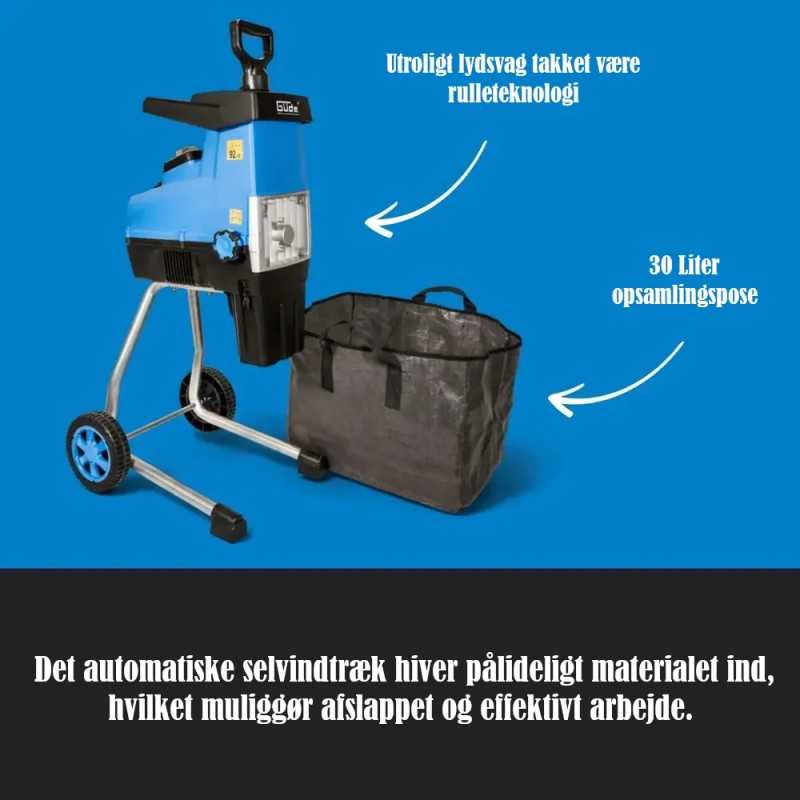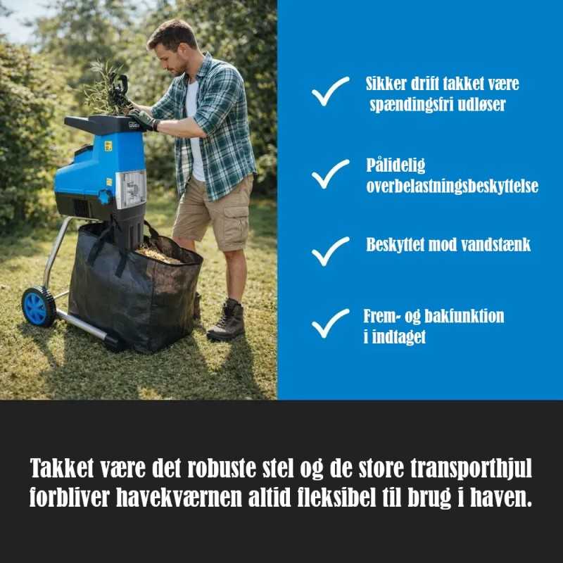 Materen kan hakke grener opp til 44 mm i diameter, som så kan samles i 30 L oppsamlingsposen.