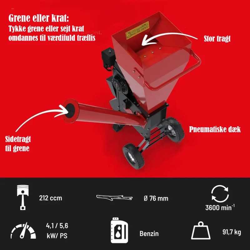 Ideell for deg med en mellomstor hage og mye hageavfall å hogge gjennom. Den har en stor trakt som kan ta grener opptil 76 mm tykkelse. Den har også en side trakt.