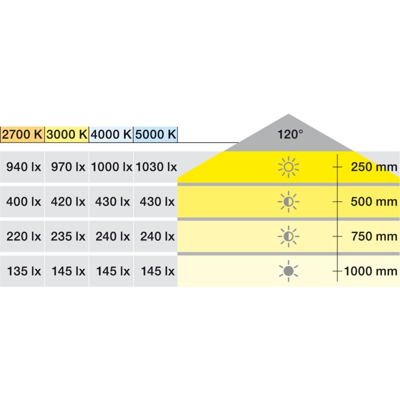 | Varm hvit 3000 K | 4,8 | 460 | 96 | 4 m | 5 |