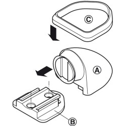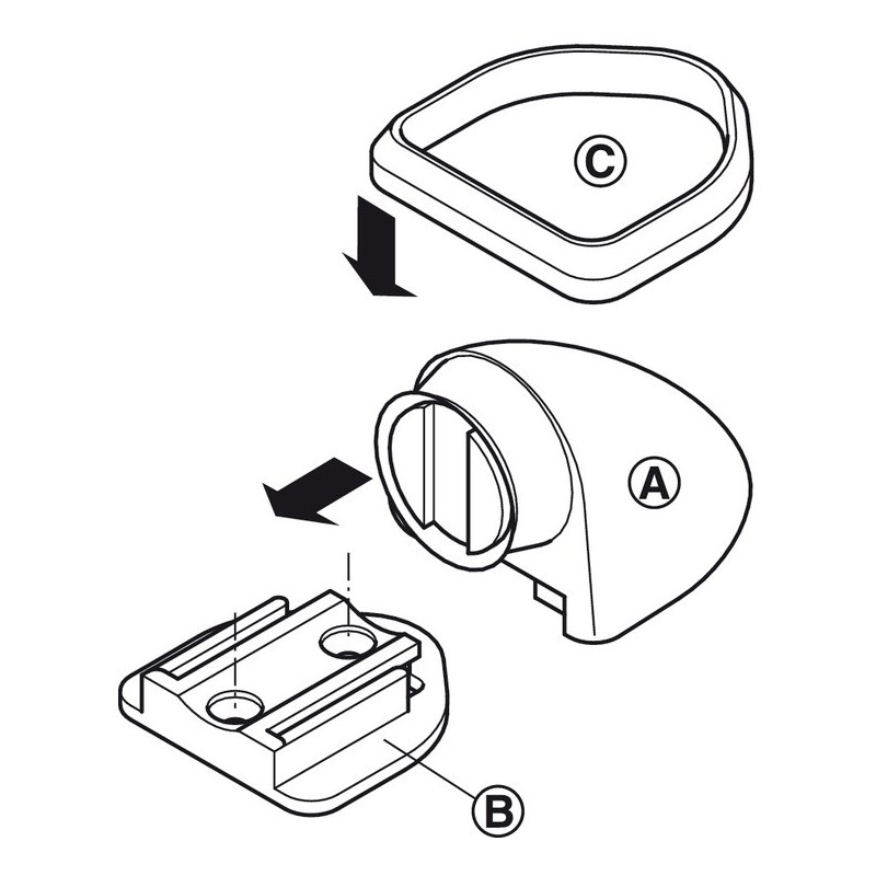 Husets sokkel (B) skrues på emnet, hvoretter huset (A) skyves på sokkelen (B). Dekselet (C) klipses på for å feste delene. Motstykket skrues på døren motsatt huset.