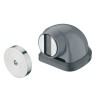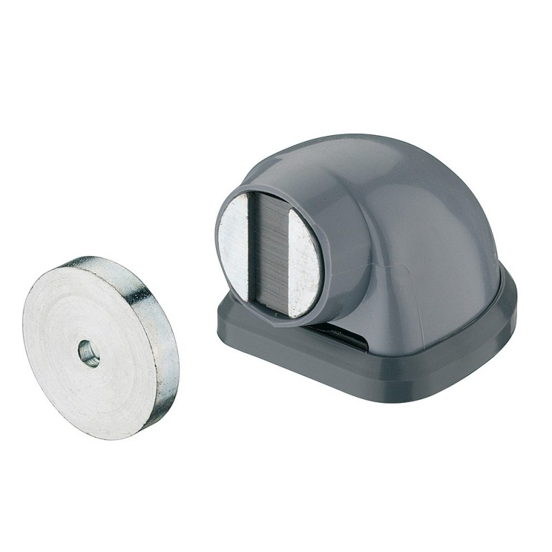 Låsestopper for gulvmontering. Huset er i grå eller brun plast og motstykket er i stål.