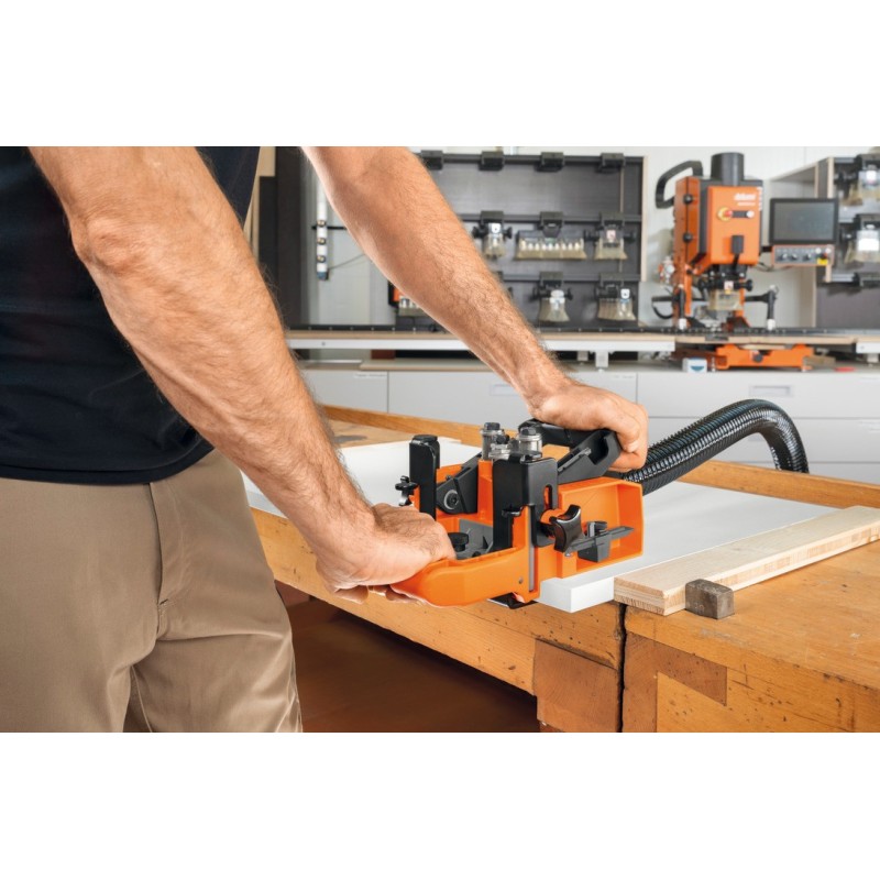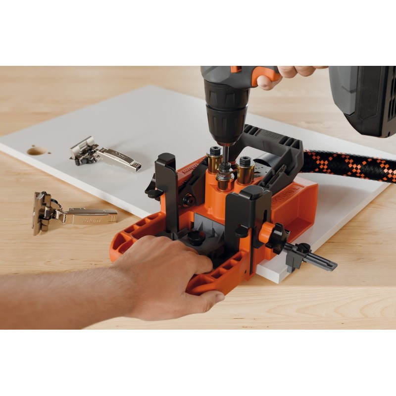 Presisjon er en viktig del av hengselmontasje. Denne borelære sørger for at boremarkeringene og borehullet sitter som det skal.