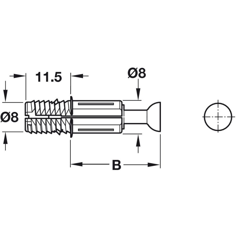Denne modellen er med ekspansjonsbolt. Ved tilspenning av samlebeslaget sprer bøsningen seg og trykker gjengen inn i treet. Jo kraftigere tilspenningen er, jo mer holdbar blir samlingen også.