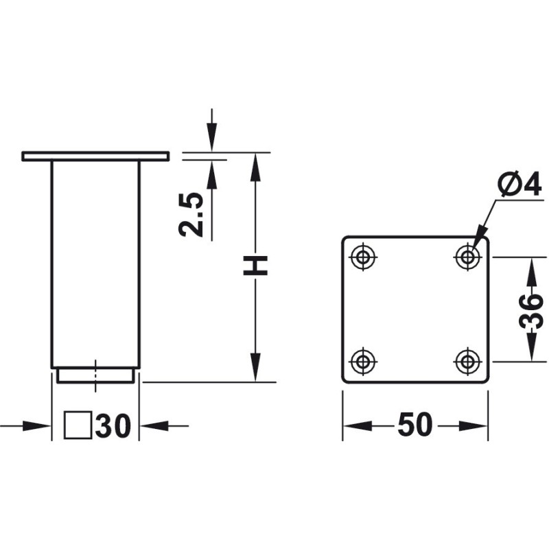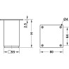 Møbelfoten er kvadratisk og monteres ved påskruing av den innebygde monteringsplaten.
