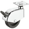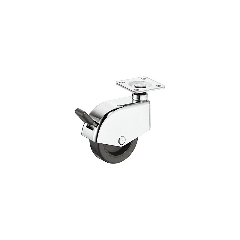 Møbelhjul med et beskyttende hus i krom. Dette hjul er styrbar og kommer med bremse og montageplade.
