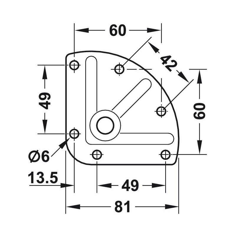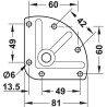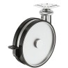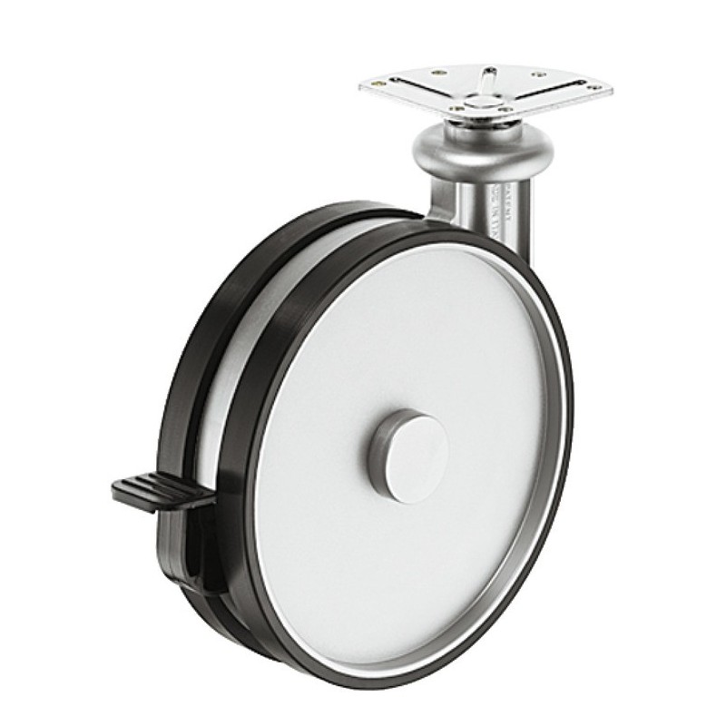 Flott møbelhjul i et aluminiumsfarget hus med hjul og bremser i svart plast. Dette hjulet er styrbart og kommer med bremsen og en trekantet monteringsplate som monteres med 6 skruer.