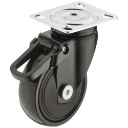 Flott styrbart hjul i industristål og termoplastisk gummi, som dermed gir en myk løpeflate. Dette sorte hjulet er styrbart og kommer med brems og monteringsplate