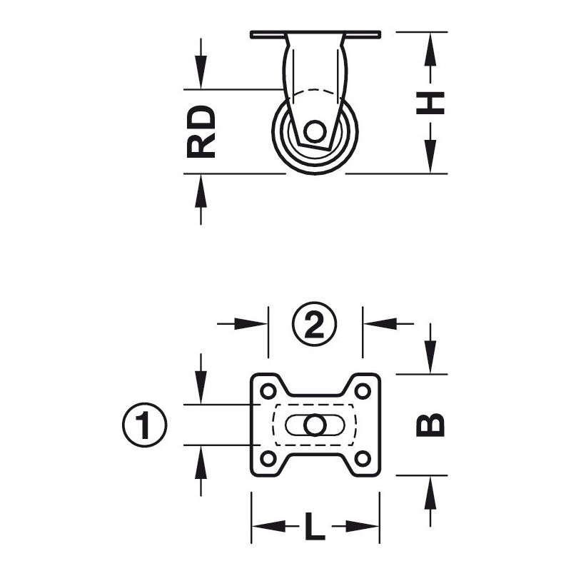 Mål (L x B) mm Hullavstand Hjul Ø RD mm Hjulbredde mm Byggehøyde H mm Bæreevne kg