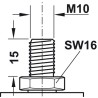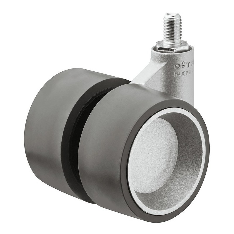 Dobbelt møbelhjul med et hus i aluminiumsfarget zinklegering, og hjul i svart plast. Dette hjulet er styrbart og kommer med gevindtap M10 x 15 mm.