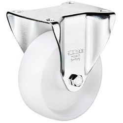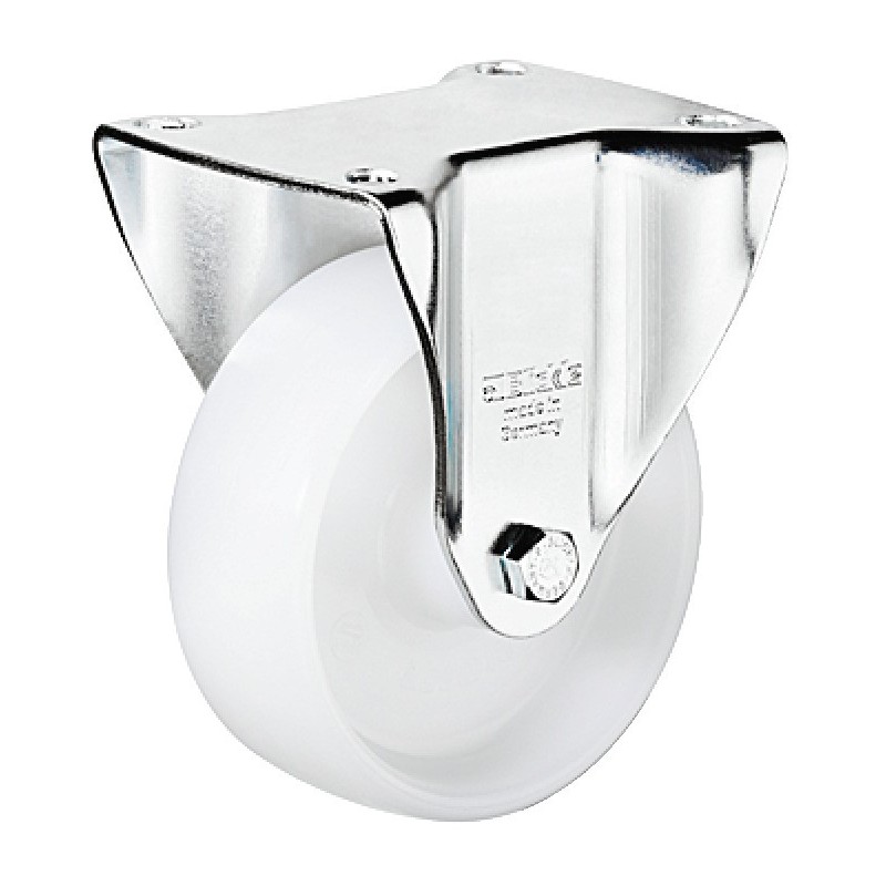 Fast redskabshjul i hvit polyamid og med høy bæreevne. Denne hjulet kommer med en fast monteringsplate som skrus fast med 4 skruer.