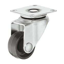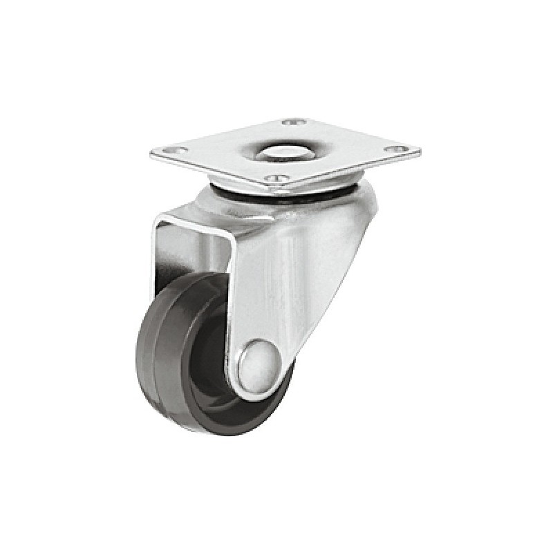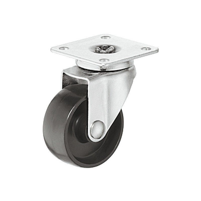 Lekkert styrbart redskaps hjul i svart plast med et hus av forzinket stål. Denne modellen har monteringsplate og har et dobbelt kulelager i dreiekronen.