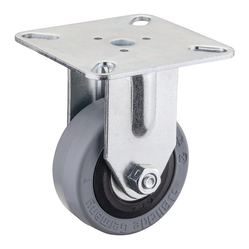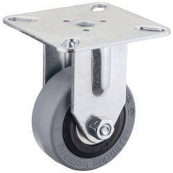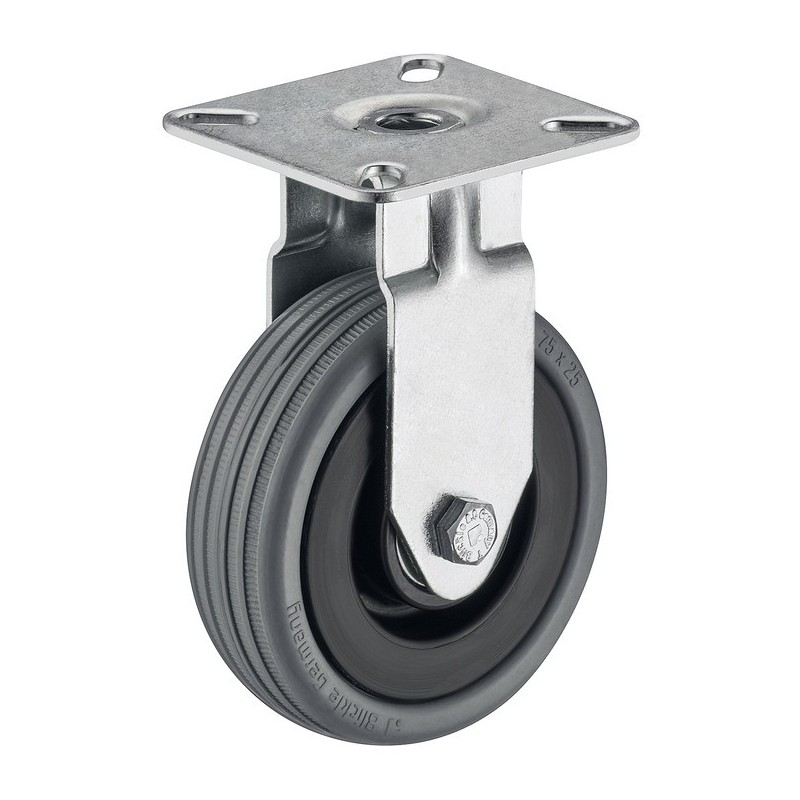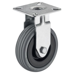 Fast redskaps-hjul i svart plastpolyamid med en løpeflate i massivt gummi og med et hus i forzinket stål. Dette hjulet har en myk løpeoverflate som ikke lager merker og gir hjulet lav rullemotstand, samt med en fast monteringsplate.