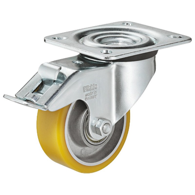 Motstandsdyktig redskaps hjul i gule polyuretan hjul. Dette hjulet er spesielt motstandsdyktig mot mekaniske påvirkninger, det har stor skjærfasthet og rivestyrke, og lager ingen merker. Det er spesielt elastisk og har en 92° Shore A materiale hardhet.