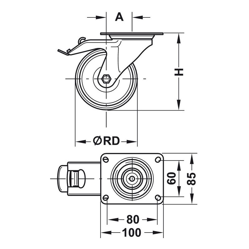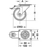 Hjul Ø RD mm Hjulbredde mm Byggehøyde H mm Bæreevne kg Mål A mm