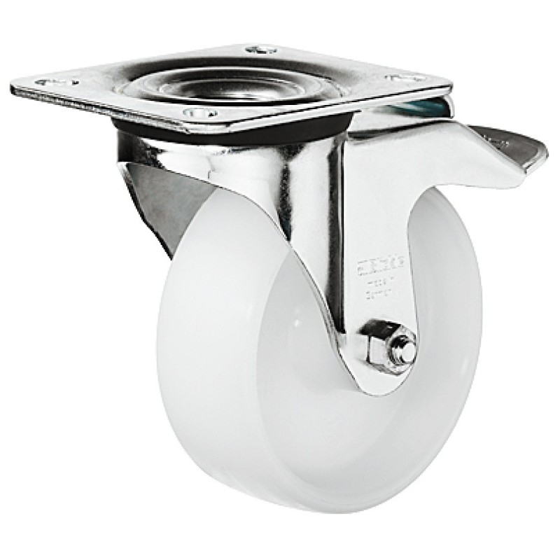 Pent og enkelt redskaps hjul i hvit polyamid og med et hus i forzinket stål. Dette hjulet er styrbart og kommer med brems og monteringsplate.