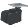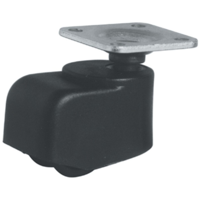 Lukket møbelhjul med monteringsplate. Dette hjulet er lukket inne/dekket av et hus av svart plast.
