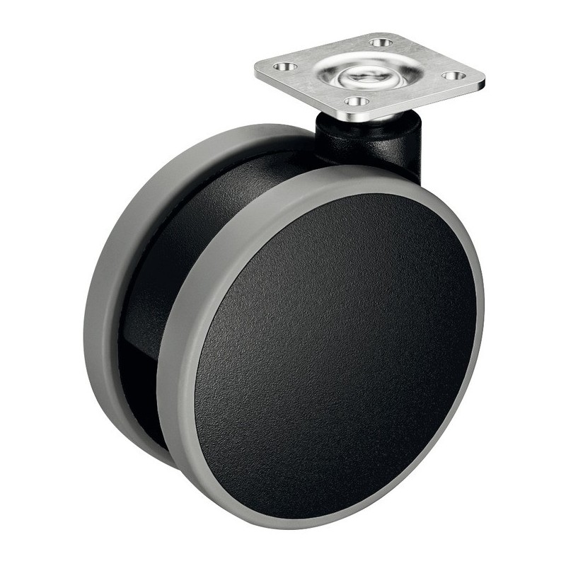 Svart møbelhjul i plast med en grå løpeflate. Hjulet har et pent og enkelt design, og kommer med en høyde på 94 mm.