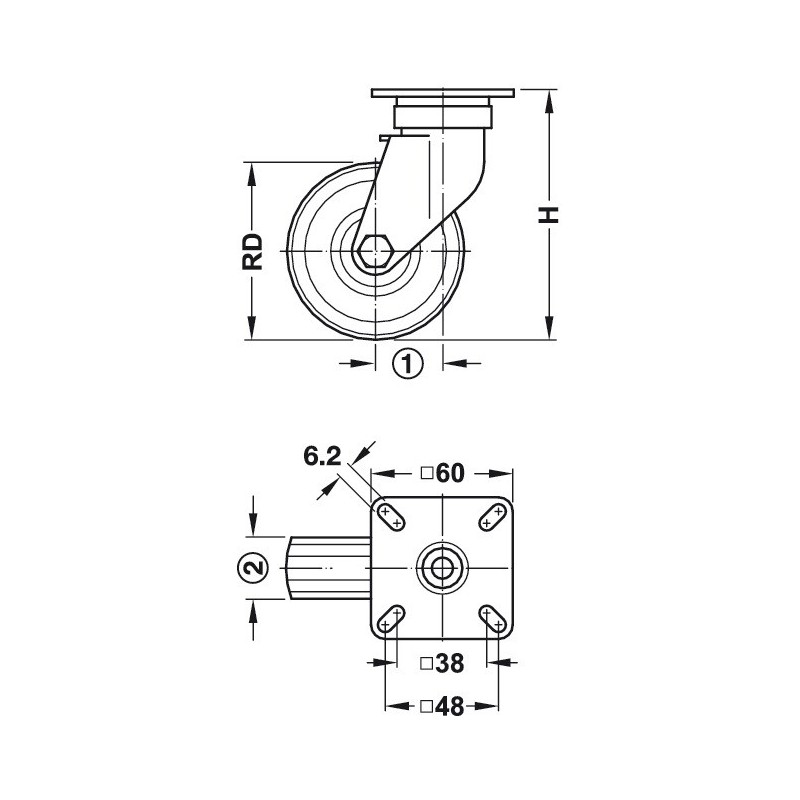 | Hjul Diameter Ø mm | Hjulbredde mm | Total høyde mm | Bæreevne kg | Avstand mm |