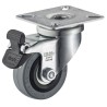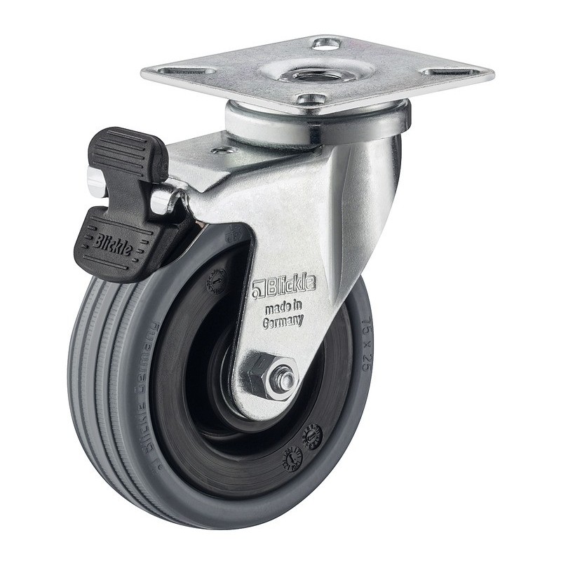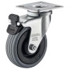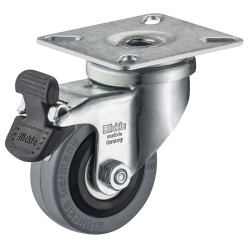 Klassisk møbelhjul, også kjent som redskaps hjul, med massiv grå gummiring. Gummiringen gjør at hjulet ikke lager merker, samt gir en liten rullemotstand. Dette hjulet er styrbart og kommer med brems og monteringsplate.